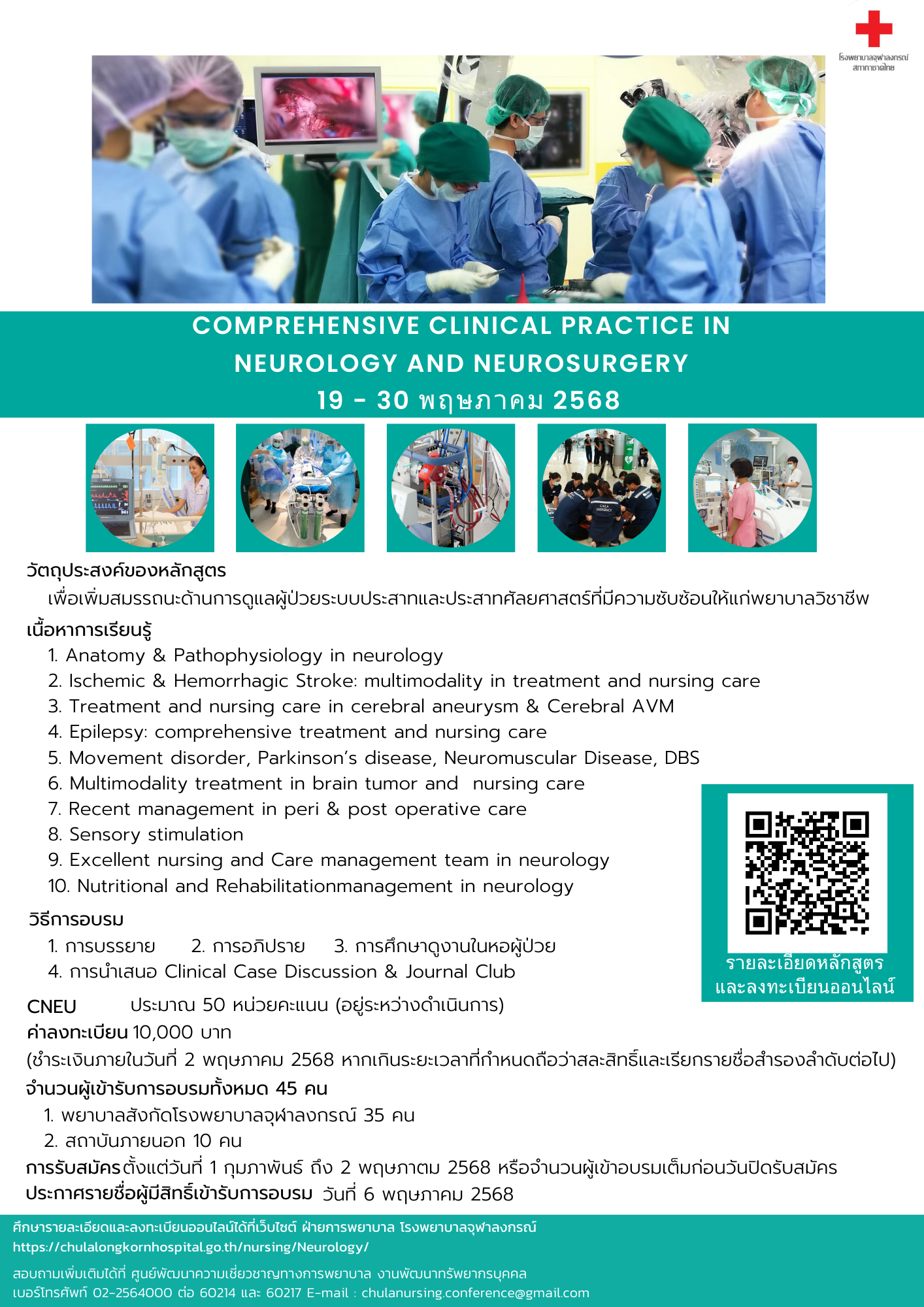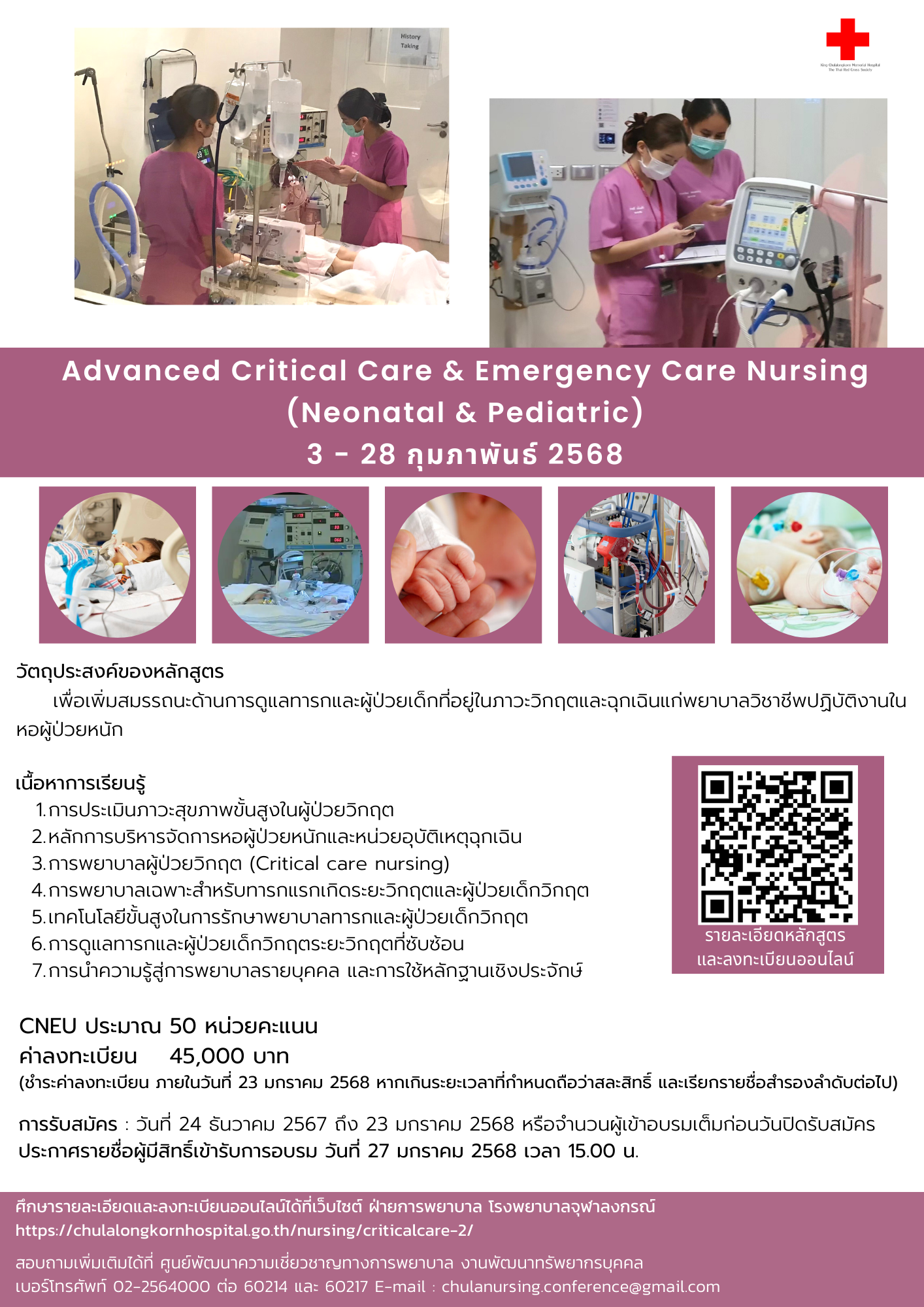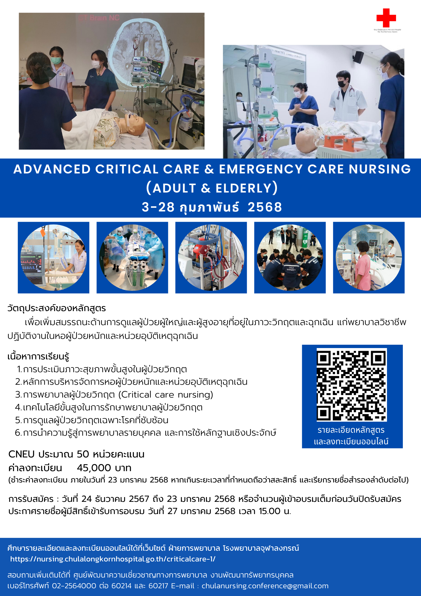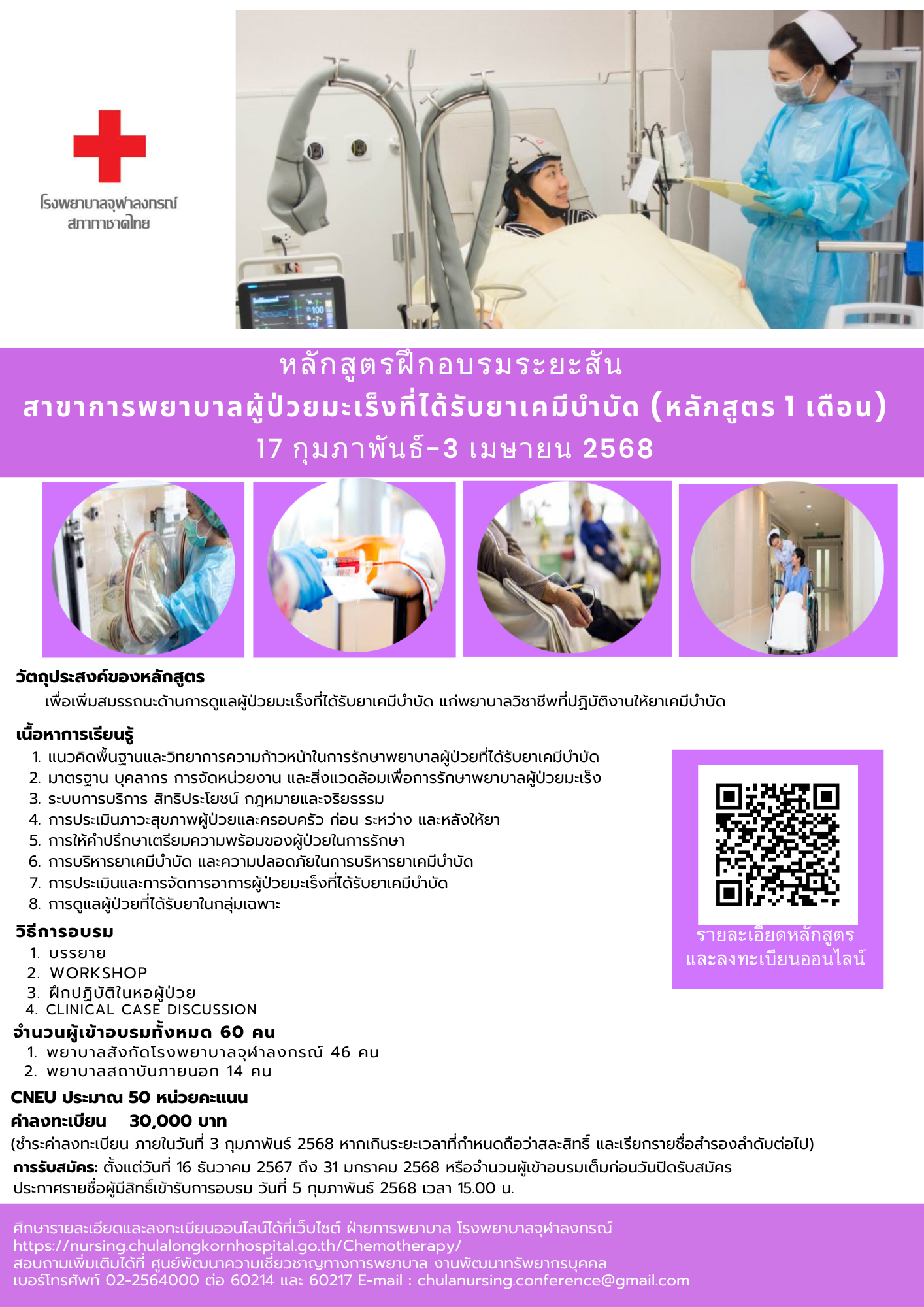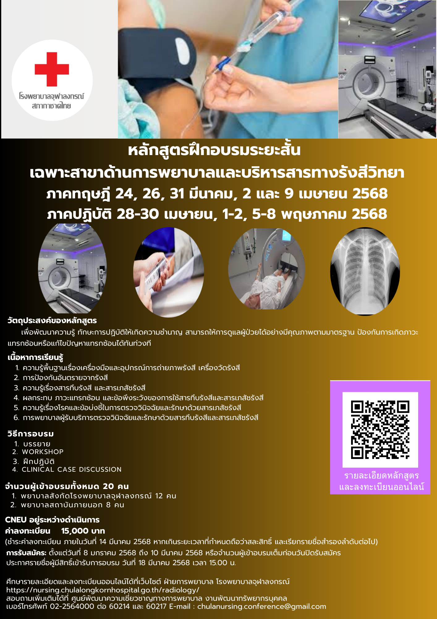 หลักสูตรอบรม (ยังไม่มีเปิด) หลักสูตรฝึกอบรมระยะสั้น เฉพาะสาขาด้านการพยาบาลและบริหารสารทางรังสีวิทยารายละเอียด..หลักสูตรฝึกอบรมระยะสั้น สาขาการพยาบาลผู้ป่วยมะเร็งที่ได้รับยาเคมีบำบัด (หลักสูตร 1 เดือน) ประจำปี 2568รายละเอียด..หลักสูตร Neurology: 2568รายละเอียด..Trauma Care: Quality Team Approach 2568รายละเอียด..Advanced Critical Care & Emergency Care Nursing (Neonatal & Pediatric)รายละเอียด..Advanced Critical Care & Emergency Care Nursing (Adult & Elderly)รายละเอียด..