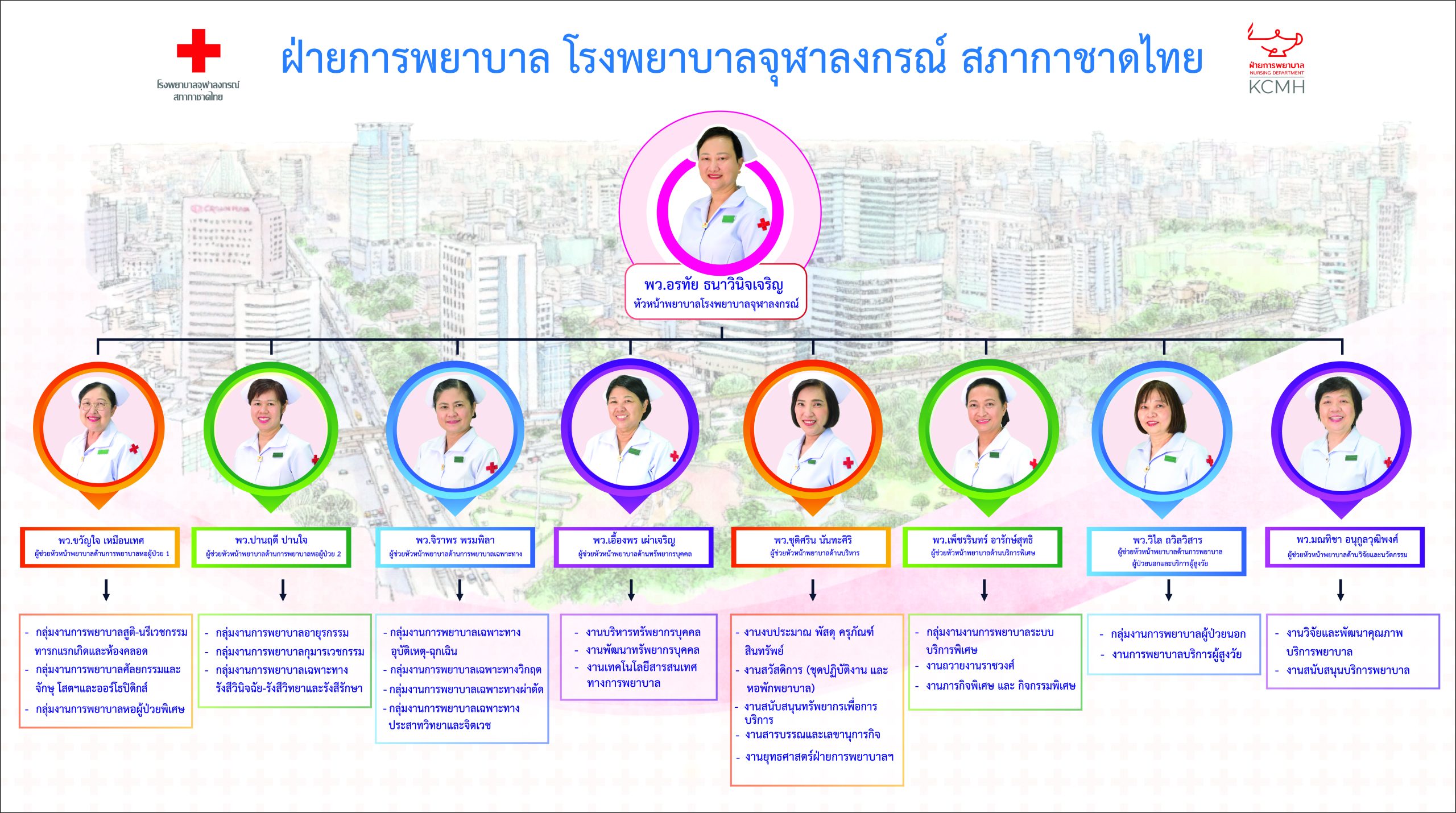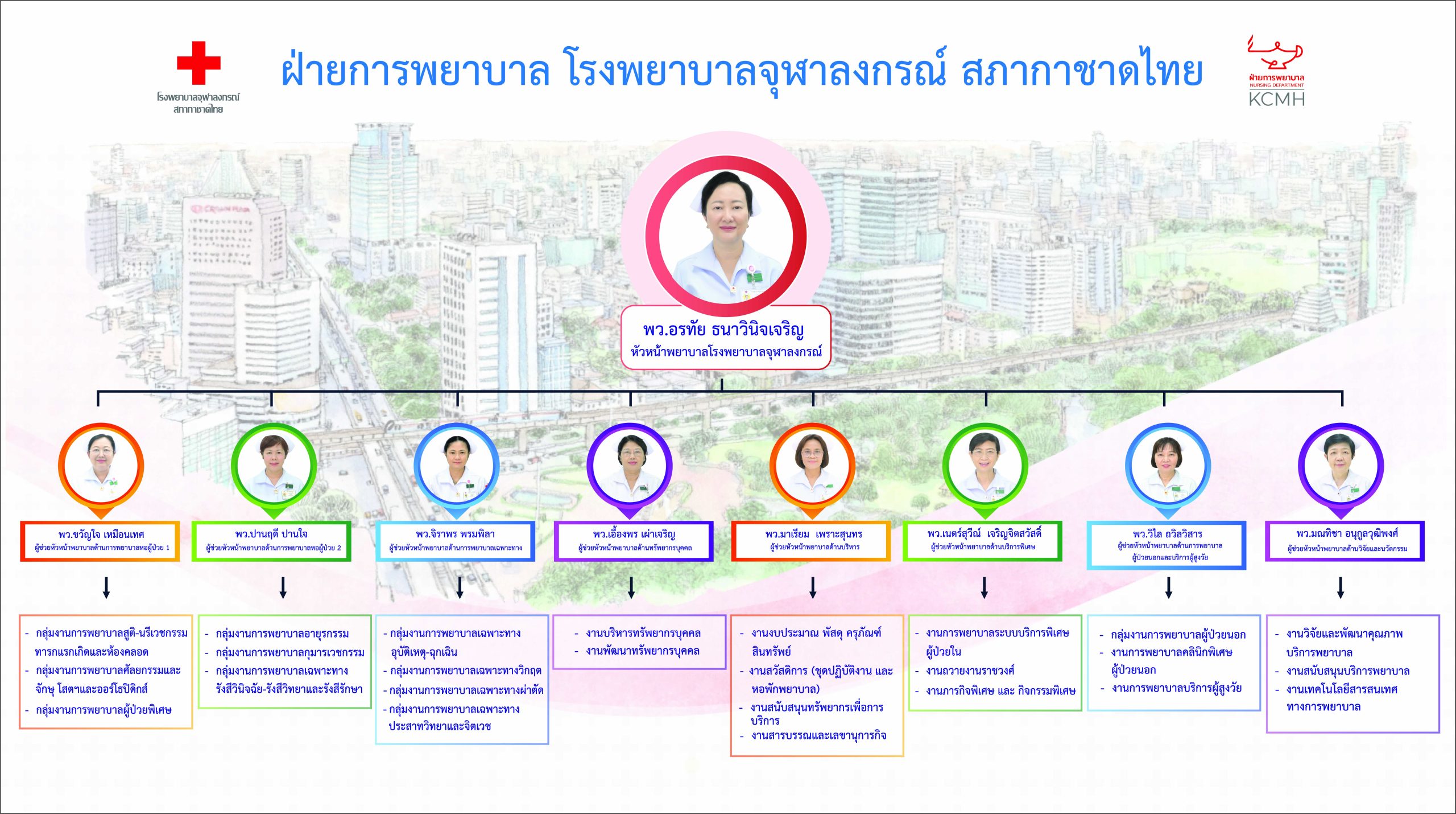 ผู้บริหารฝ่ายการพยาบาล วิสัยทัศน์ ฝ่ายการพยาบาล โรงพยาบาลจุฬาลงกรณ์ เป็นผู้นำทางการพยาบาลในระดับสากล พันธกิจ จัดและออกแบบระบบบริการพยาบาล และ การผดุงครรภ์ตามมาตรฐานวิชาชีพให้สอดคล้องกับโรงพยาบาลในระดับ Super tertiary care เป็นแหล่งเสริมสร้างประสบการณ์ทางวิชาชีพ กำหนดทิศทางการจัดบริการ และการปฏิบัติการพยาบาลของทุกหน่วยบริการพยาบาลและควบคุมกำกับผู้ประกอบวิชาชีพการพยาบาลให้ปฏิบัติตามพระราชบัญญัติวิชาชีพการพยาบาล